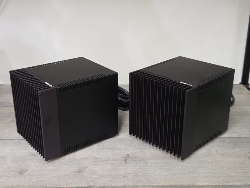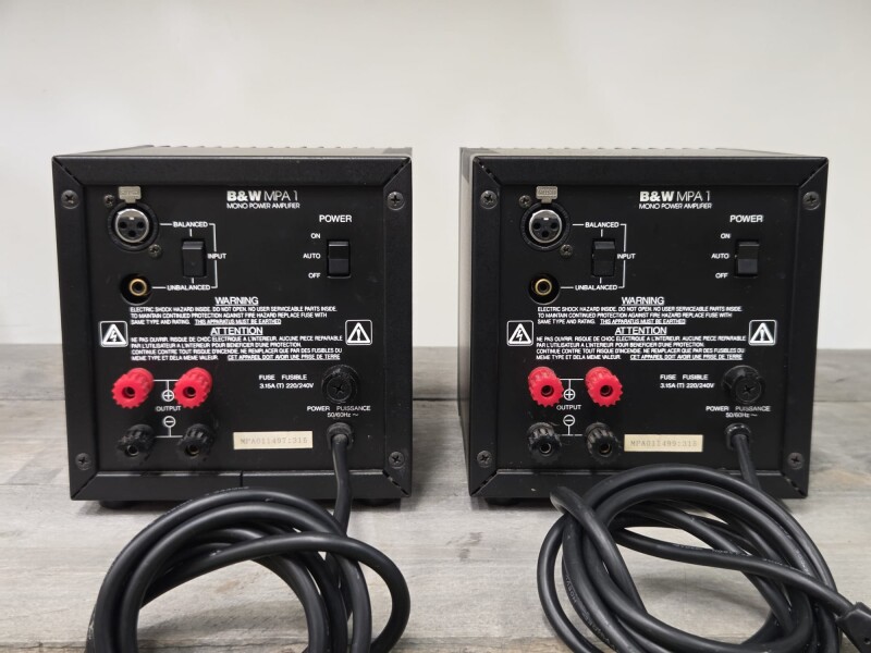 Bowers & Wilkins MPA1 Monoblock Power amplifiers. Geschikt voor bi-wiring en bieden een hoge kwaliteit voor zowel hoge / midden tonen als lage tonen. Het design is later overgenomen door ROTEL die onder de naam RMB-100 de zelfde blokken nog enige tijd geproduceerd heeft.